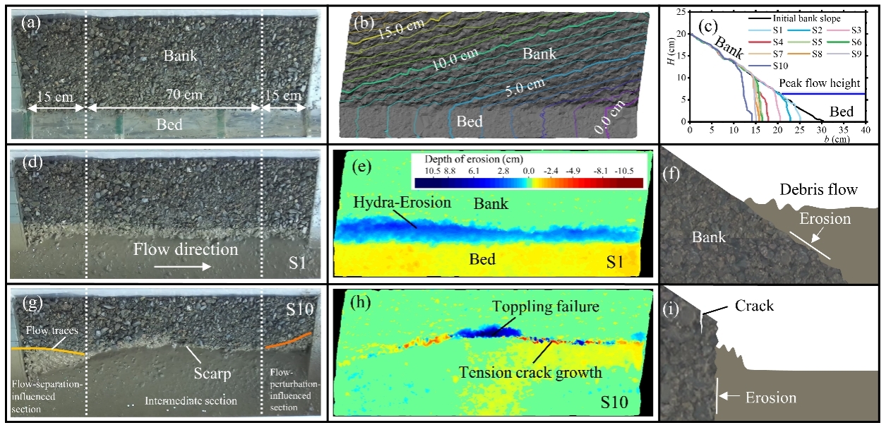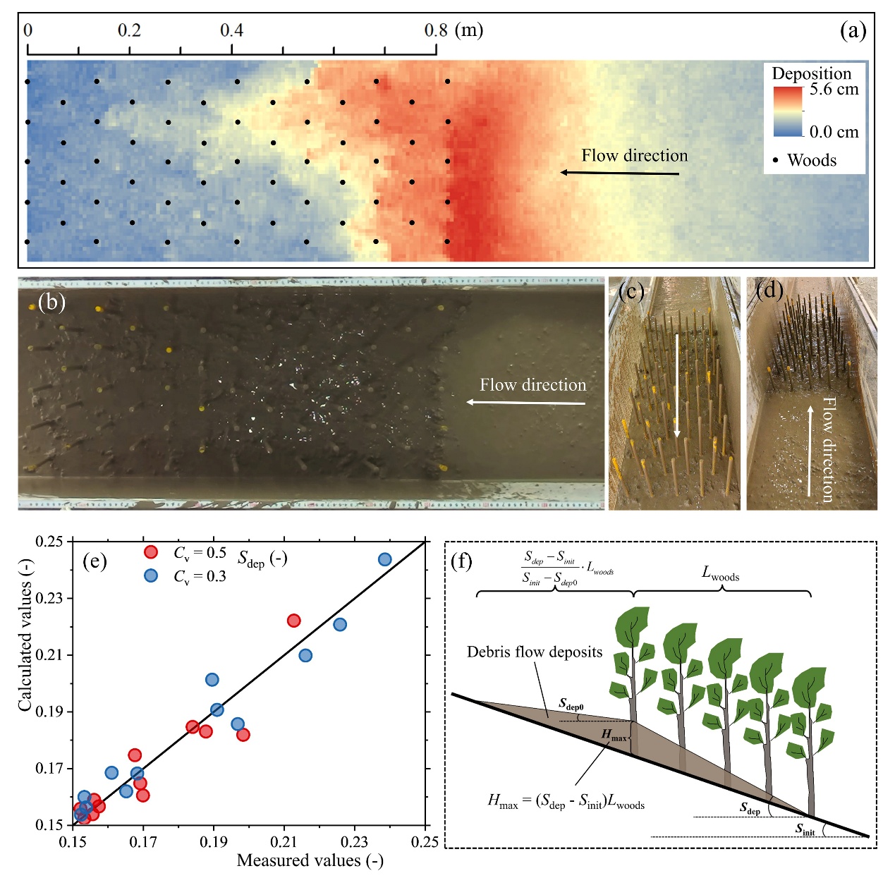 进而在沟道沟岸植被对泥石流冲淤过程调控方面,揭示了裸土沟岸退缩与泥石流侧向侵蚀互馈机制并构建了沟岸退缩参数化模型;阐明了泥石流作用下草本植物对沟岸侵蚀的调控机制,明确了沟岸侵蚀效率与草本植物特征参数间的关系;探明了沟道内乔木林对泥石流固体物质淤积效应的附加拦截机制,提出了考虑林带影响的泥石流淤积比降和淤积量计算方法。该研究初步构建了“拦砂坝淤积地貌-拦砂率-生物措施”之间的动态反馈模型,突破了防治工程减灾功效以传统静态评估为主的局限性,为泥石流防治工程减灾功效动态评估与运行维护提供理论依据。