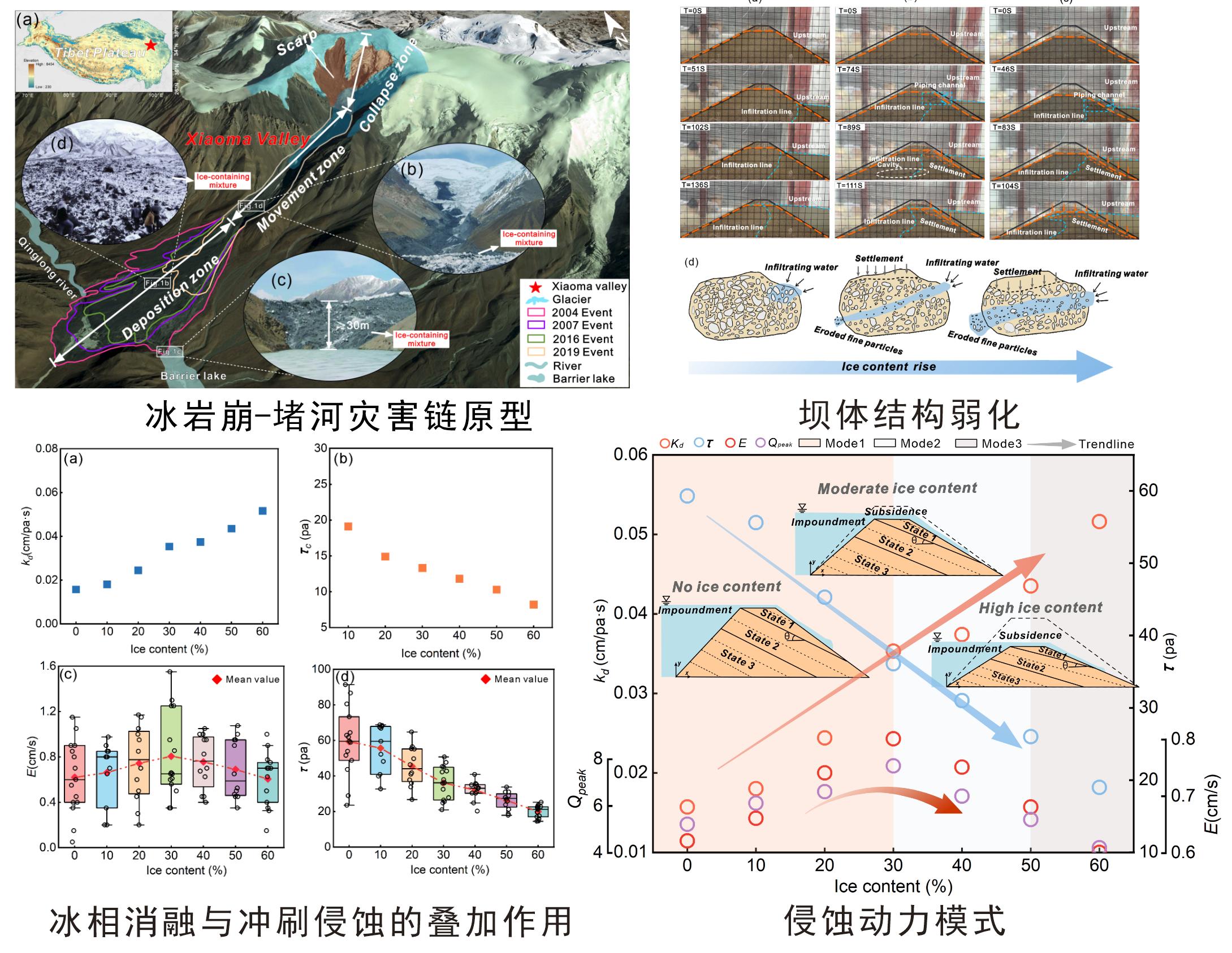 研究成果得到了国家自然科学基金项目(42571015,U22A20565)与中国科学院成都山地所自主部署项目(IMHE-CXTD-01)的联合资助,相关成果以“Investigation on the breach mechanism of ice-containing blockage dams: Insights into the impact of ice melting on overtopping erosion”为题,发表在地学一区Top期刊 Engineering Geology。