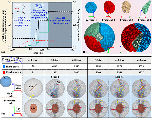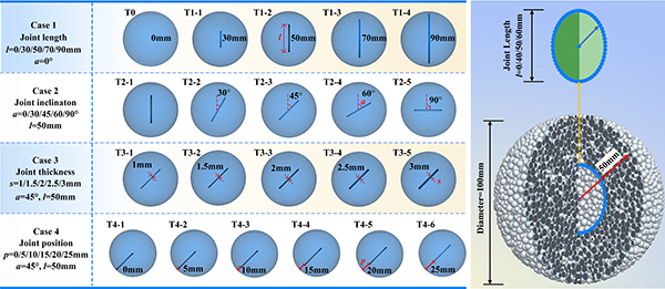针对上述问题,中国科学院成都山地灾害与环境研究所何思明团队吴永副研究员等,基于离散元方法(DEM)研究了三维节理结构对滚石冲击破碎行为的影响,提出了“体积破碎率”等定量指标,并揭示了节理在影响破坏模式、能量耗散等方面的重要作用。研究基于室内试验与数值模拟相结合的方法,探讨了预存节理的几何特征(长度、角度、厚度、位置)对滚石冲击破碎的机制影响。