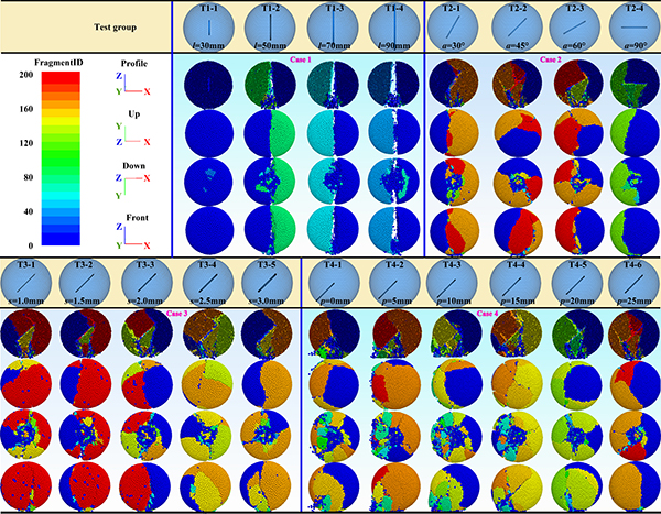 研究结果表明,滚石内部的预存节理几何特征在很大程度上决定了其冲击破碎的模式与能量耗散过程:当节理长度超过临界值(约为滚石直径的40%)时,滚石更容易沿节理断裂。节理倾角为45°时破碎最为剧烈,主碎块数量最多,体积破碎率最高。当节理厚度接近模型中最大颗粒半径时,裂纹更易沿节理贯通,形成大尺度破碎。而节理位置若位于滚石中间偏边缘区域,能显著提升整体破碎效果,使碎块尺寸分布更均匀。此外,节理的存在降低了滚石的冲击峰值力,加快了裂纹扩展和破裂过程,最终导致滚石反弹动能大幅下降,仅为初始动能的25%左右。这些结果清晰揭示了节理对滚石破裂行为的主导机制。