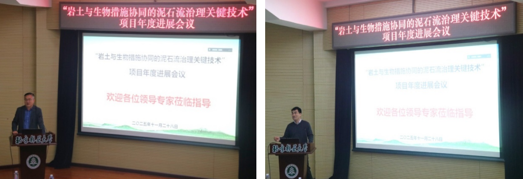 11月28日,国家重点研发计划项目“岩土与生物措施协同的泥石流治理关键技术”2025年度进展会议在北京林业大学召开。会议认真总结了2025年度工作进展、阶段性成果以及2026年度工作计划。会议由项目牵头单位中国科学院成都山地所组织,课题承担单位北京林业大学承办。成都山地所科技处处长葛永刚研究员、中国地质调查局水文地质环境地质调查中心张发旺研究员共同主持会议。