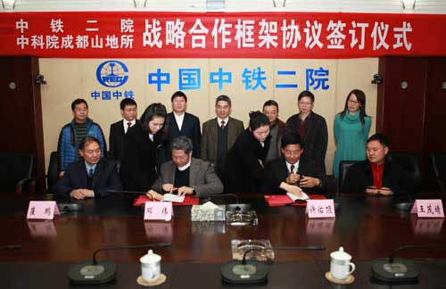 2015年2月5日,成都山地所邓伟所长与中铁二院许佑顶副总经理代表双方在成都签订了《战略合作框架协议》。双方表示以川藏铁路建设为契机,坚持“需求导向、科技支撑、成果共享、服务发展”的原则,围绕铁路选线、建设和运营期间的山地灾害问题,一致同意建立长期的、全面的、深度的战略合作关系,重点在山地灾害区域分布、风险评估、防治及监测预警等方面加强科技合作与人才交流培训,共同推动双方快速、健康、可持续发展。