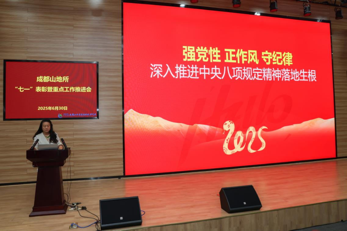 为庆祝中国共产党成立104周年,6月30日,成都山地所召开“七一”表彰暨重点工作推进大会。会议通报了研究所上半年重点工作进展和下半年工作计划,开展了深入贯彻中央八项规定精神学习教育党课宣讲,进行了专题警示教育并举行了“七一”表彰。所领导班子成员、全所在职党员和职工、研究生代表等200余人参加了大会。党委书记谭多财主持会议。