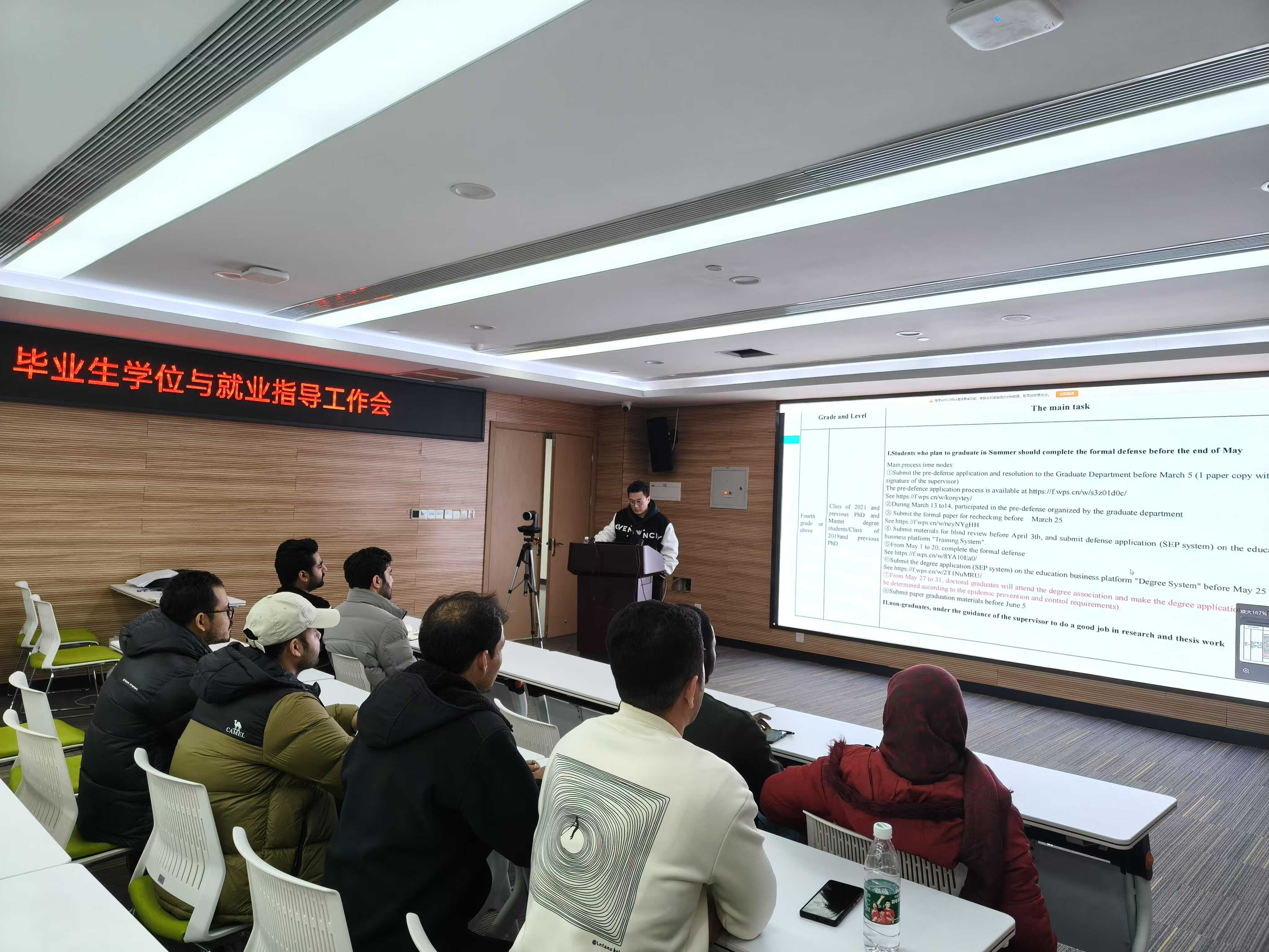 研究生部教育主管张静雯介绍了从就业准备到签署协议再到离所办理等就业过程中的注意事项,并介绍了研究所近年来毕业生就业去向,帮助学生缓解就业焦虑。教育主管刘列克为留学生进行了夏季毕业时间节点和流程,预答辩和答辩一站式服务链接,让留学生们更清晰的了解申请学位注意事项。