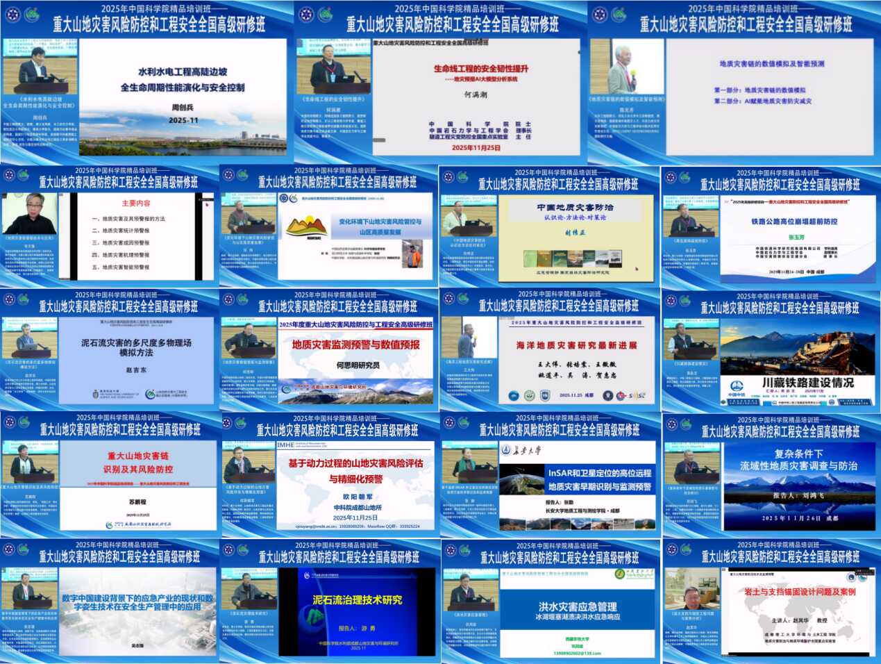 研修班邀请了何满潮院士、周创兵院士、陈光齐院士和应急管理部国家灾防院科技委员会主任刘传正研究员、四川师范大学邓伟教授、成都山地所赵吉东研究员、成都山地所何思明研究员、中国科学院重庆研究院韦方强研究员、中国铁道科学院张玉芳研究员、中铁二院工程集团有限责任公司蒋良文教授级高工、长安大学张勤教授、西藏自然资源厅刘鸿飞教授级高工、北京应急技术创新联盟吴志强教授级高工、西藏农牧学院巩同梁教授等19位院士专家,从生命线工程的安全韧性提升、水利水电高陡边坡全生命周期性能演化与安全控制、人工智能与地质灾害链的数值模拟及智能预测等方面专题授课。授课内容涵盖高危高位崩塌、滑坡、泥石流、水电基地高陡边坡、冰湖溃决灾害链等的快速感知、监测预警、形成机理、动力学过程及全过程风险防控等,突出了国家重大工程防灾减灾需求与多源技术的深度融合以及灾害防治实践。