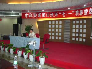 参观结束后,举行了“七一”表彰暨党课报告会,党委副书记副所长赵永涛同志主持了会议。他首先宣读了山地所《关于表彰2006-2007年度优秀共产党员、先进党支部和优秀党务工作者的决定》,对朱波等11位优秀党员和泥石流与动力学党支部等3个先进支部和韦方强等3名优秀党务工作者进行了表彰。随后,党委书记关晓岗同志结合保持党员先进性和山地所发展现状为全体党员做了题为《一流研究所与共产党员的先进性》的党课报告。