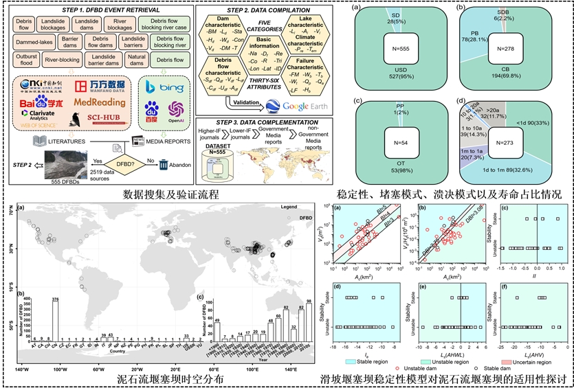 泥石流堰塞坝不仅会显著改变水文地质环境,还可能触发链式次生灾害,典型表现为溃坝前的上游淹没与溃坝后的下游洪水。野外实测数据是揭示该类堰塞坝形成机理与演化规律的核心支撑,但既往研究多聚焦于局部案例解析,缺乏系统性数据整合与多案例对比,严重制约着泥石流堵江灾害链的预测与防治。