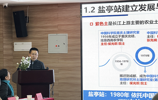 盐亭站站长周明华研究员从平台条件改善、任务争取、成果与人才培养、示范与社会服务等方面汇报了盐亭站近年主要工作进展。朱波研究员围绕“紫色土氮转化特性与调控机制”作了专题报告。