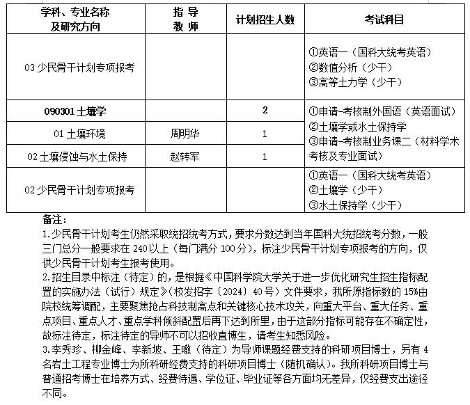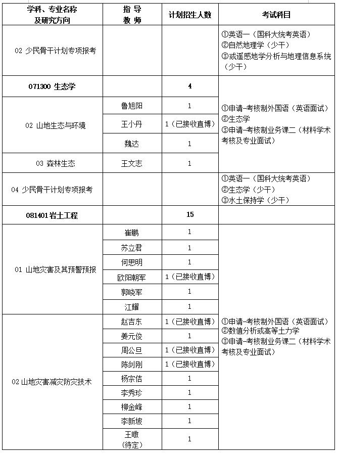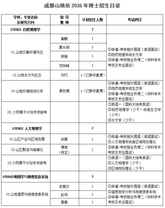 特别说明:我所招生简章招生人数目前是按照招生的总人数公布(国科大公布的招生目录信息是按照预计招收直博生和预计接收统招生分开公布),直博生占当年博士招生计划数,直博生接收实际情况以我所公示的《2026年度中国科学院、水利部成都山地灾害与环境研究所推荐免试硕士研究生(直博生)拟录取公示》为准,本简章也将明确标明指标情况,请考生关注。