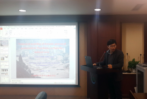 此次活动邀请来自澳大利亚联邦科学与工业研究组织(CSRIO)的Raymond Cohen 博士和尼泊尔的Amar Deep Regmi博士与成都山地所青年学者相互交流最新研究成果,探讨科研合作方向和计划。Raymond Cohen博士作了题为Integrated Flood Modeling and Mitigation Analysis的主题学术报告,介绍了其团队在洪水模拟、火灾模拟、滑坡模拟等方面的研究成果。青促会会员欧阳朝军副研究员、张建强副研究员分别作了题为Numerical modeling of dynamic process of geohazards in Wenchuan earthquake-induced area和Landslide in Koshi river basin, Central Himalaya的学术报告。余方威博士作了题为Particle crushing and its influence on the shear Behavior of sand的学术报告。此次学术沙龙活动让大家有机会与国外灾害数值模拟方面专家面对面、近距离探讨山地灾害数值模拟等系列技术问题,并展示了山地所青年科研人员在灾害领域的最新学术成果。