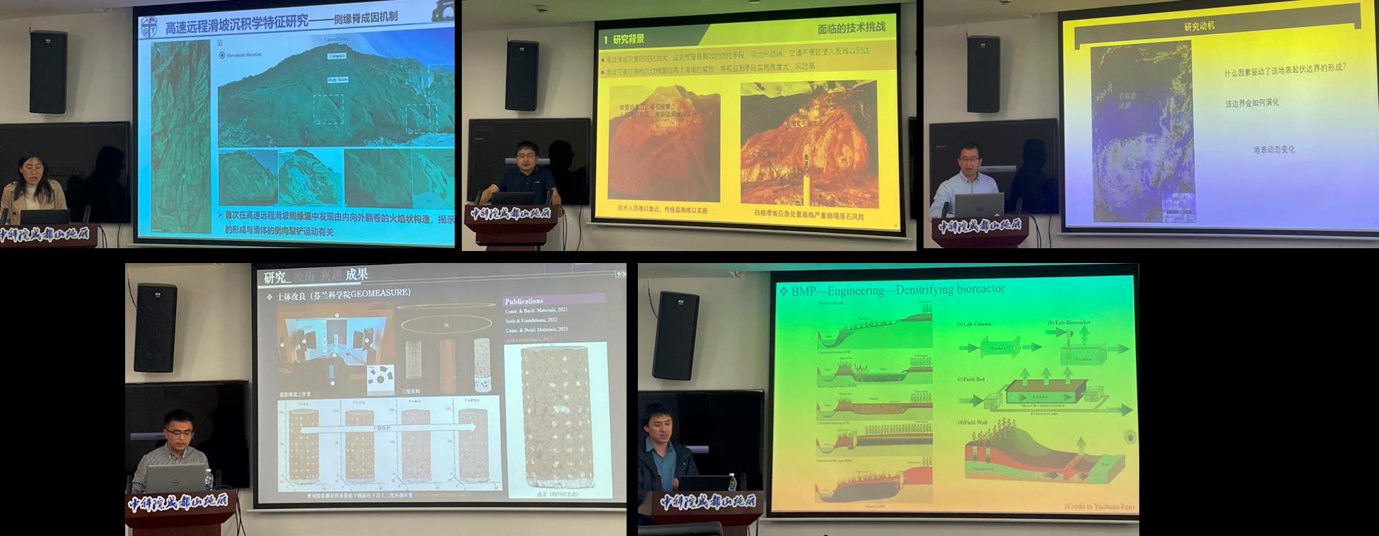 西南交通大学王玉峰教授、四川大学李海波副研究员、德国亥姆霍兹地球科学中心钟岳志博士后、法国南特大学李中森助理教授、美国密西西比州立大学范豫川博士后分别应邀作了“青藏高原高速远程滑坡运动学与动力学研究”“高陡边坡空地联合非接触监测与变形高精度解译算法”“气候波动对黄土高原侵蚀过程和黄河泥沙供应的影响”“Centrifuge modelling of laterally-loade monopiles”“最优化管理措施对农业生态系统环境、生产力和可持续性影响的研究”的精彩报告,并同与会人员展开了热烈讨论。