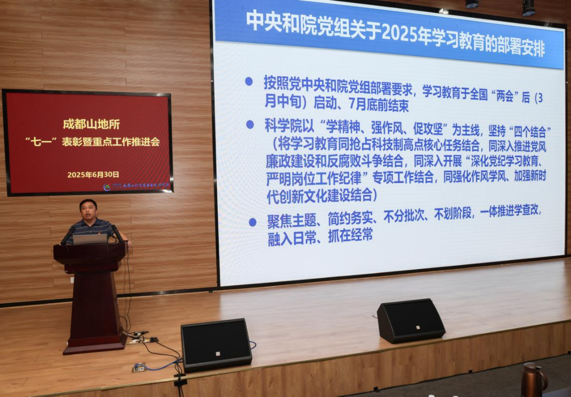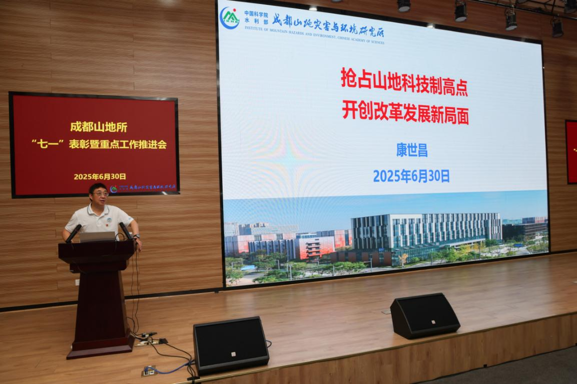 为庆祝中国共产党成立104周年,6月30日,成都山地所召开“七一”表彰暨重点工作推进大会。会议通报了研究所上半年重点工作进展和下半年工作计划,开展了深入贯彻中央八项规定精神学习教育党课宣讲,进行了专题警示教育并举行了“七一”表彰。所领导班子成员、全所在职党员和职工、研究生代表等200余人参加了大会。党委书记谭多财主持会议。