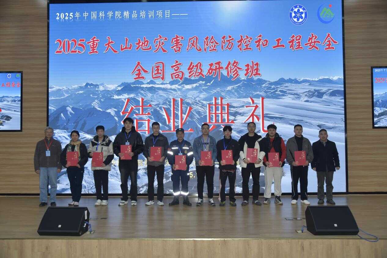 11月24日至28日,由中国科学院主办、中国科学院成都分院支持,中国科学院成都山地所承办,四川省地震局、山地自然灾害与工程安全重点实验室(中国科学院)、四川省山区减灾工程技术研究中心协办的2025年“重大山地灾害风险防控和工程安全全国高级研修班”在成都举行,并邀请中国科学院院士何满潮、中国工程院院士周创兵、日本工程院院士陈光齐等院士专家为学员授课。成都山地所所长康世昌出席开班仪式并致辞,党委书记、副所长谭多财为学员们颁发了结业证书。开班仪式由研修班组委会副主任苏鹏程主持。